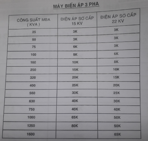 TÙY THEO CẤP ĐIỆN ÁP SƠ CẤP MBT 3P- 15KV; 22KV ; HOẶC ĐIỆN ÁP SƠ CẤP MBA 1P ; 8,660KV; 12,7KV . TA DÙNG CHÌ TRUNG THẾ ĐỂ BẢO VỆ MBT THEO BẢNG TRA SAU :